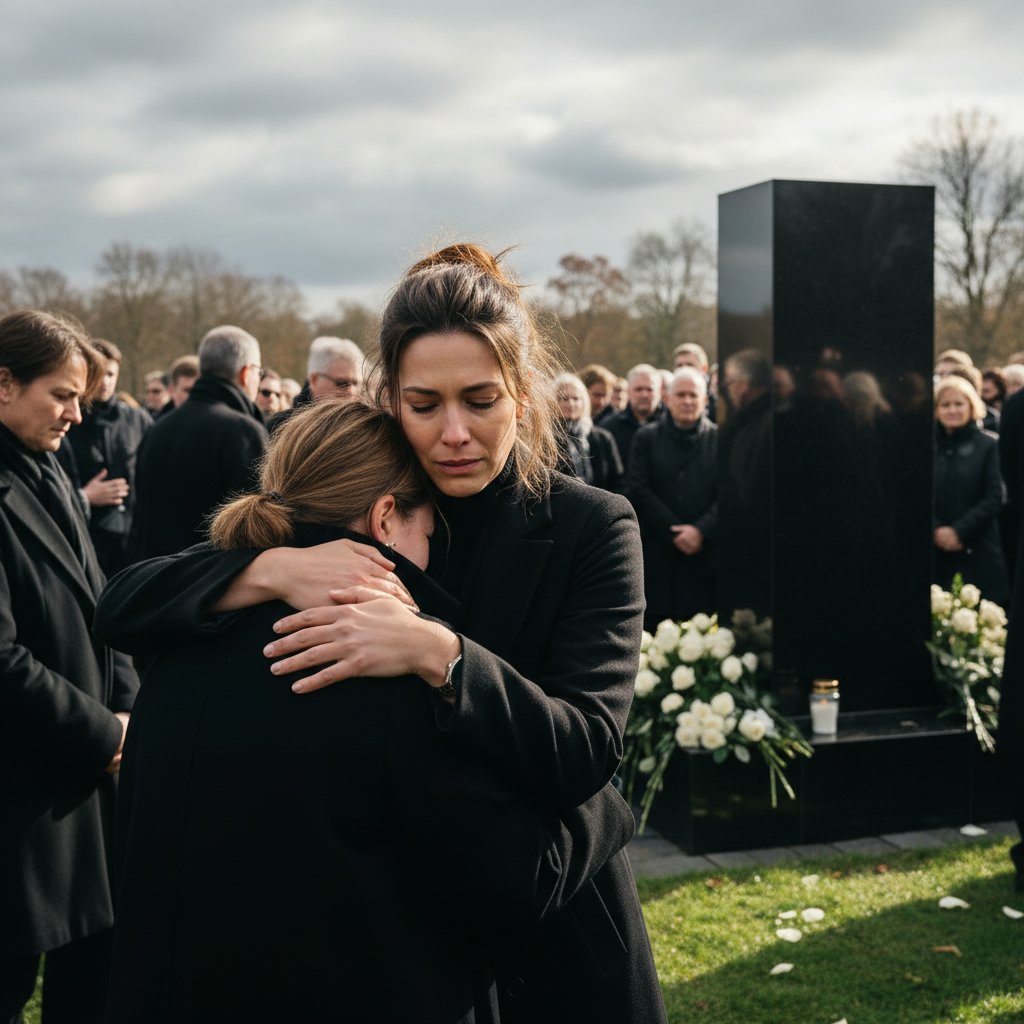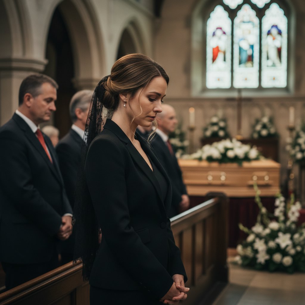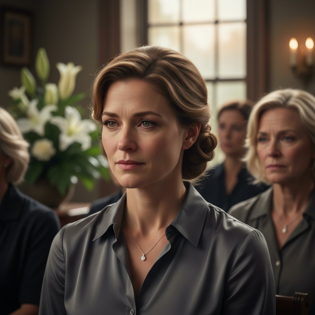 Hair arranged in a half-up style, maintaining an appearance of approachable empathy and shared grief.