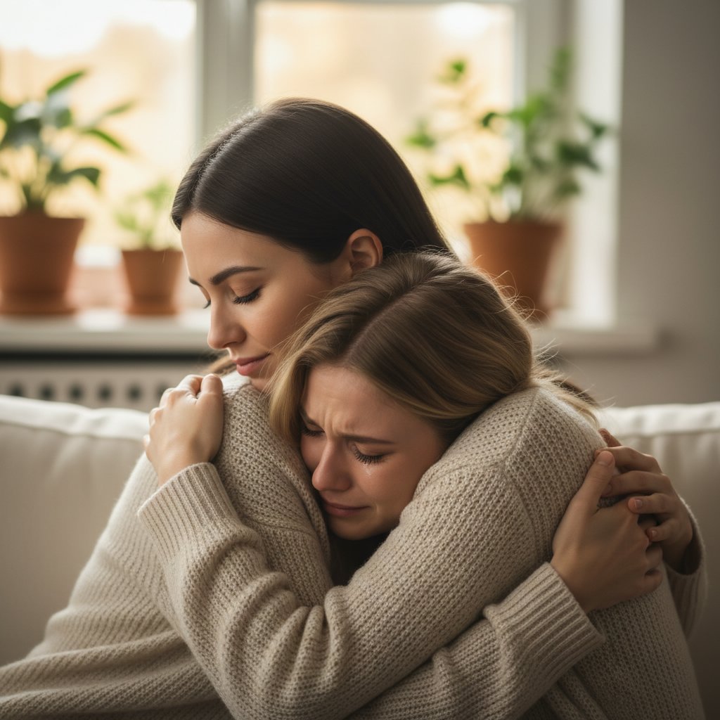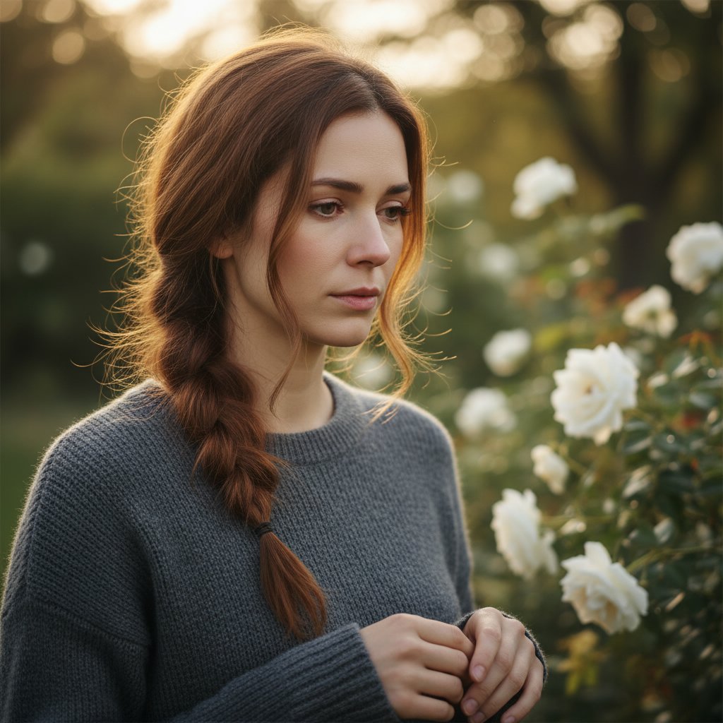 Hair softly tied back, reflecting a presence that’s both comforting and unassuming in its support.