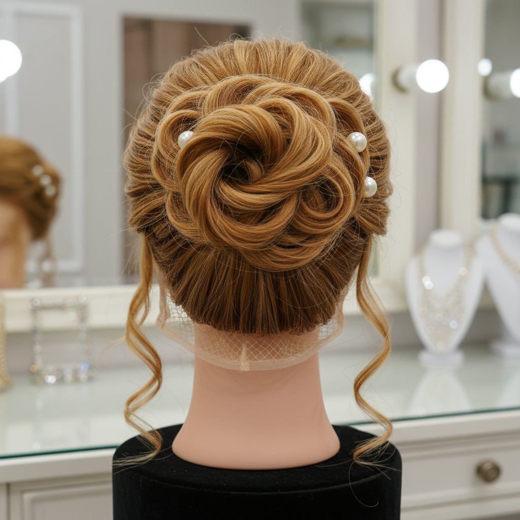 A synthetic wig styled in a chic updo, showcasing the versatility of synthetic wigs for special occasions.