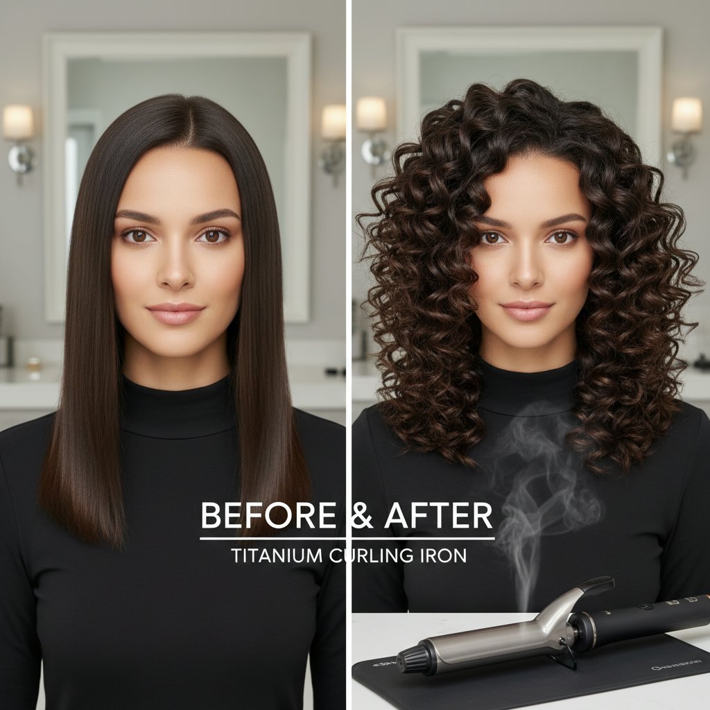 Before: Frizzy, uncontrollable hair. After: Smooth, defined curls, illustrating the frizz-reducing capabilities of titanium.