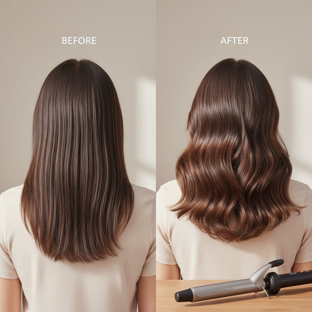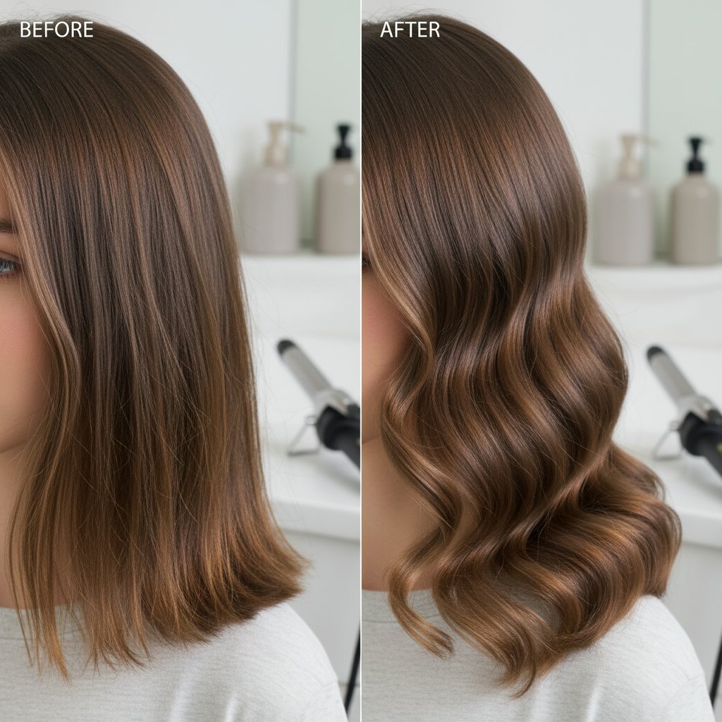 Before: Flat, lifeless hair. After: Effortless, beachy waves achieved with a larger barrel titanium curling iron.