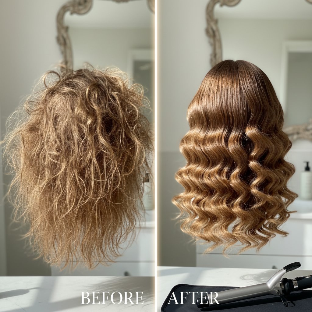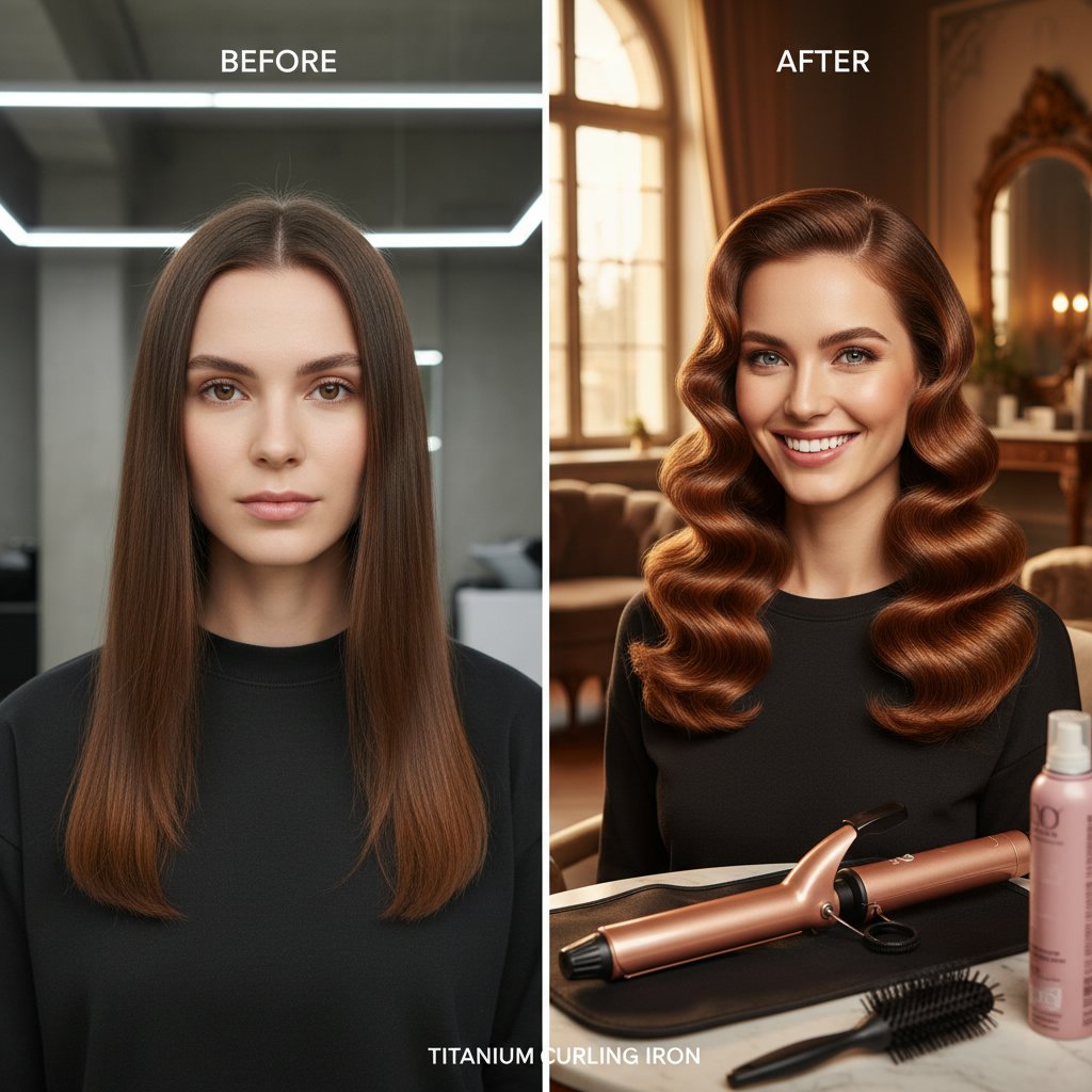 Before: Modern, uninspired style. After: Glamorous retro waves, demonstrating the versatility of titanium curling irons.