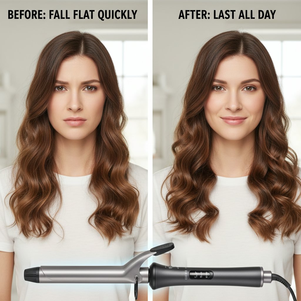 Before: Curls that fall flat quickly. After: Curls that last all day, testifying to the titanium iron's enduring effect.