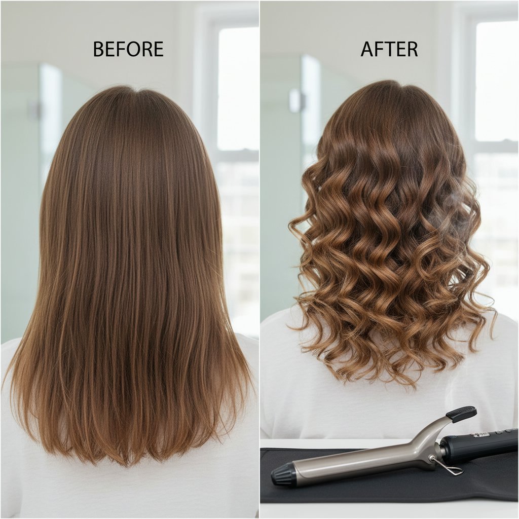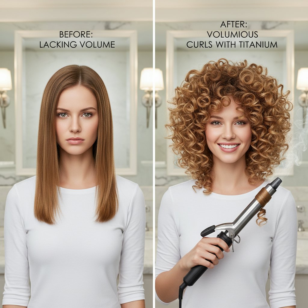 Before: Hair lacking volume. After: Voluminous curls that add body, achieved with a titanium curling iron's even heat.