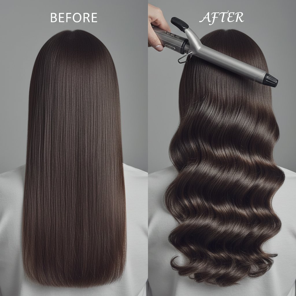 Before: Straight, uninspired locks. After: Shiny, tight curls crafted with a titanium curling iron, showcasing its precision.