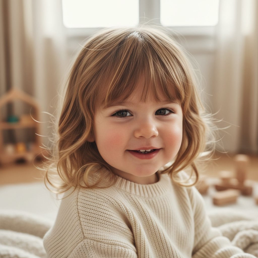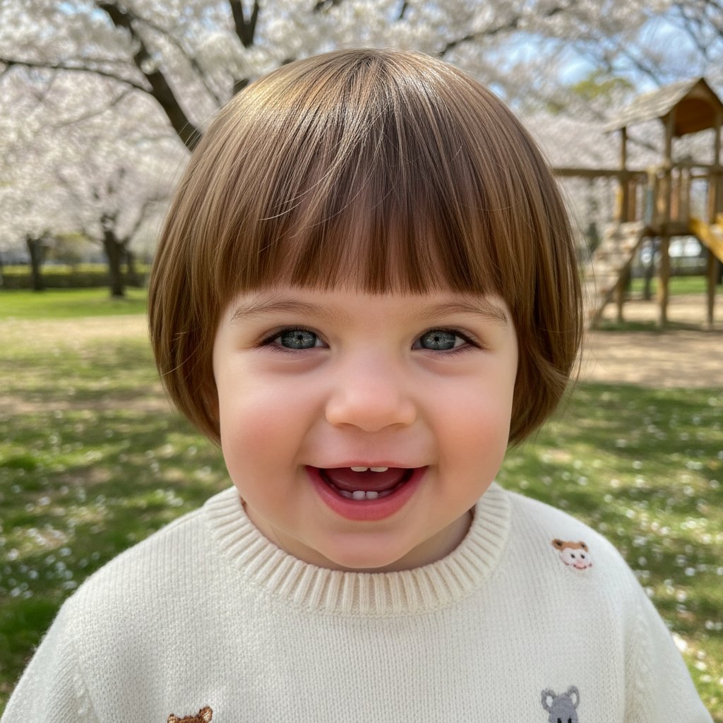A bob cut with bangs is a charming and manageable style for toddlers, framing their faces sweetly with minimal maintenance required.