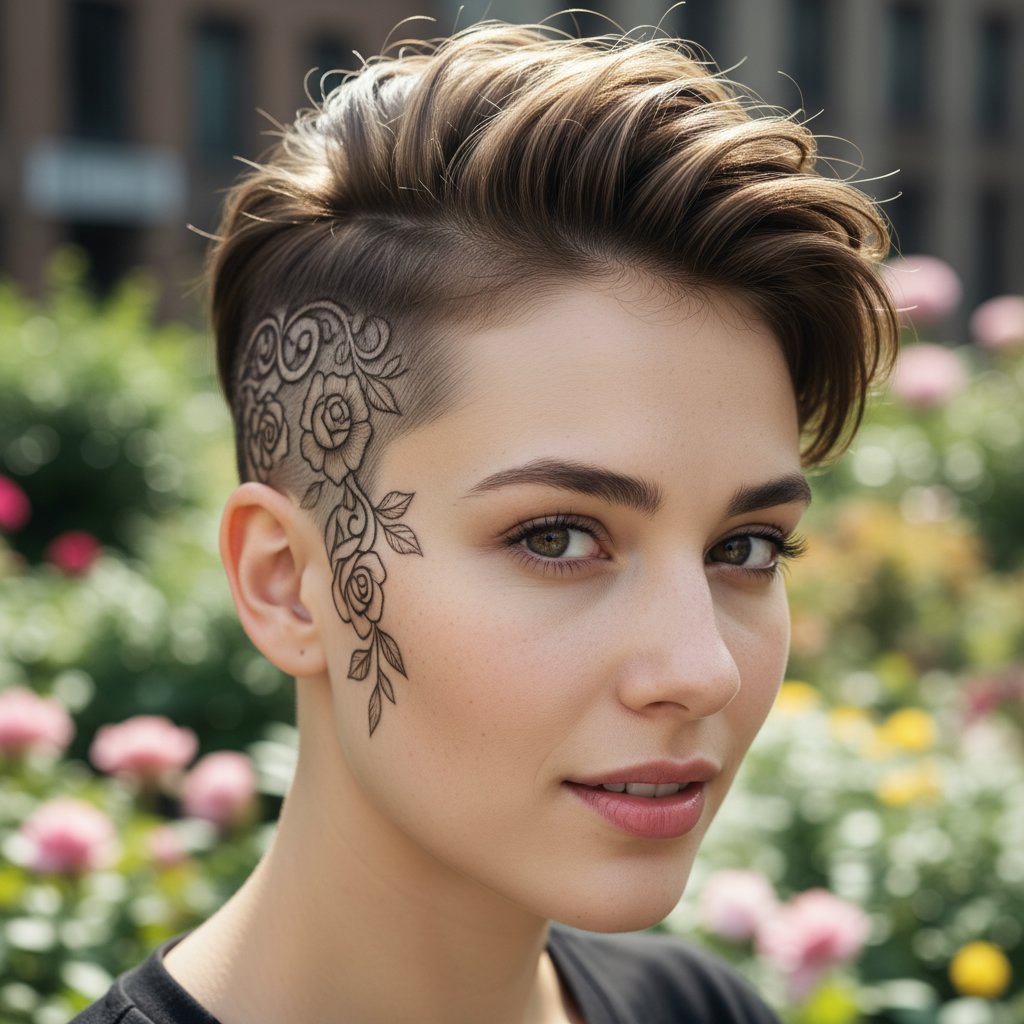 A delicate floral motif etched into the shaved side of an undercut, marrying softness with the boldness of the cut.