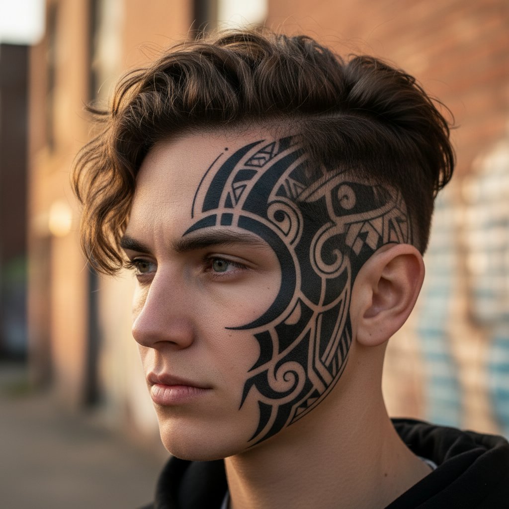 An undercut featuring a bold tribal design on the shaved side, showcasing personal heritage or inspired artistry.
