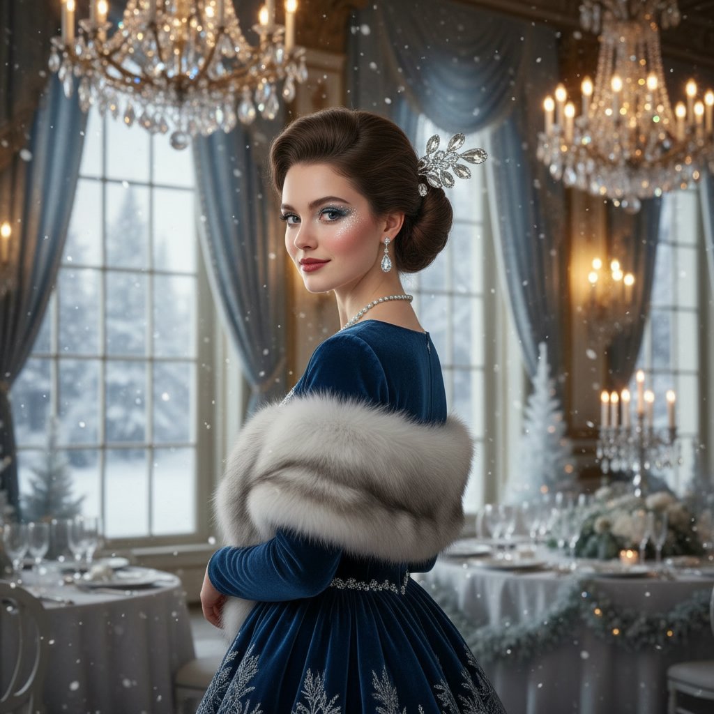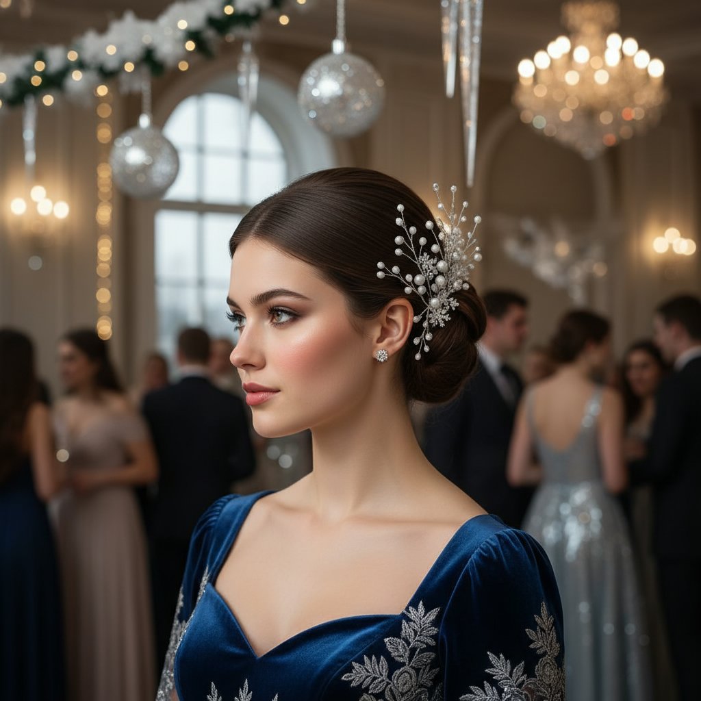 A sophisticated updo that captures the essence of winter elegance, perfect for semi-formal evenings.