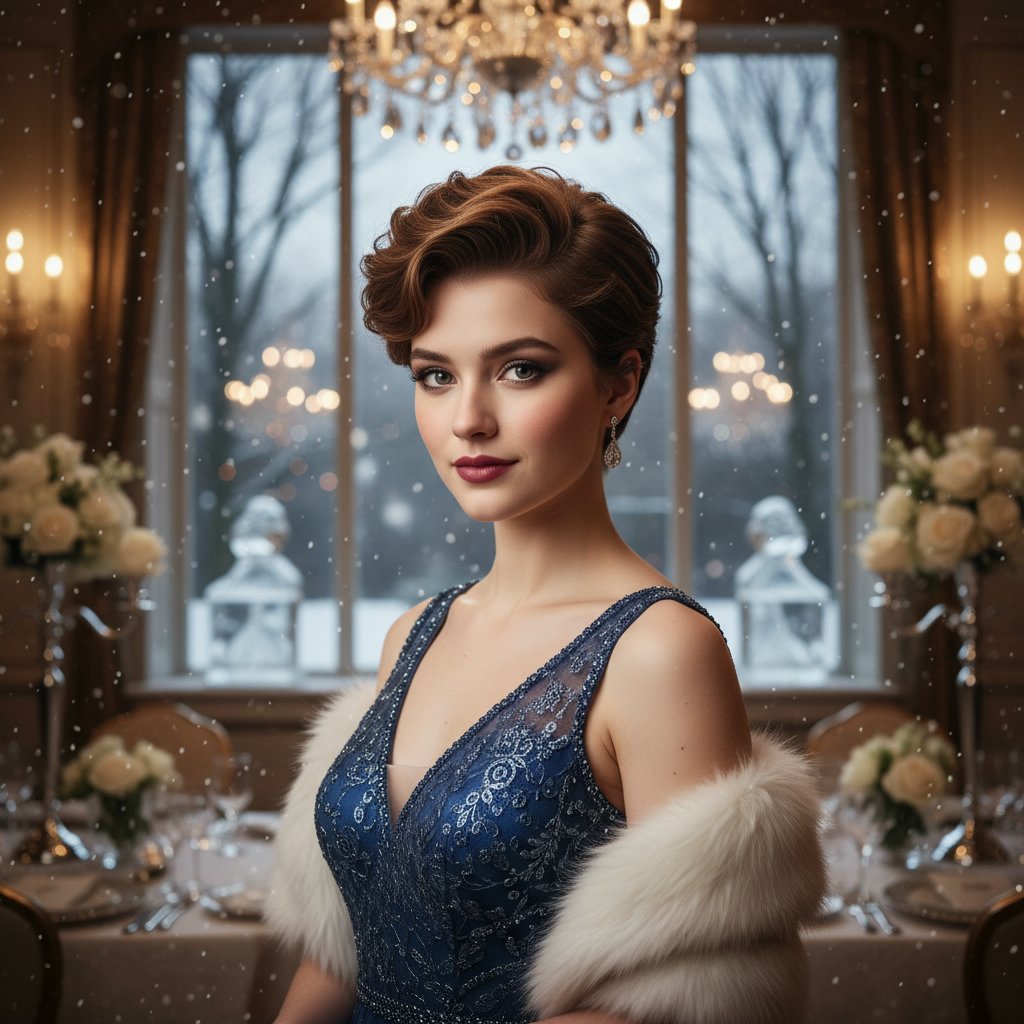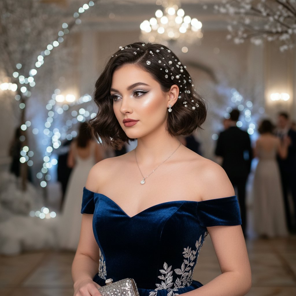 A chic tousled bob pinned with glittering accessories, capturing the festive sparkle of winter and perfect for semi-formal events.