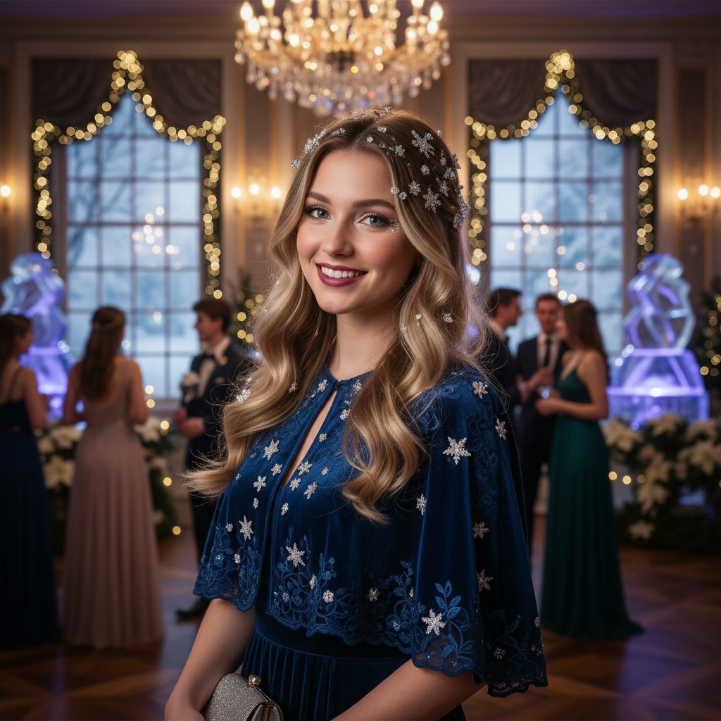 Soft, loose waves complemented by sparkling hair accessories, reflecting the festive spirit of winter formals.