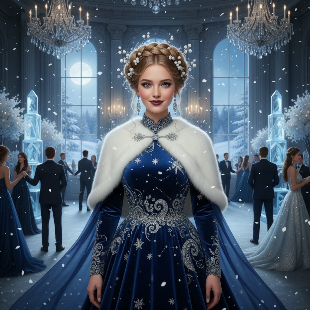 A braided crown that combines regal beauty with the whimsical charm of winter, perfect for standing out at any formal event.