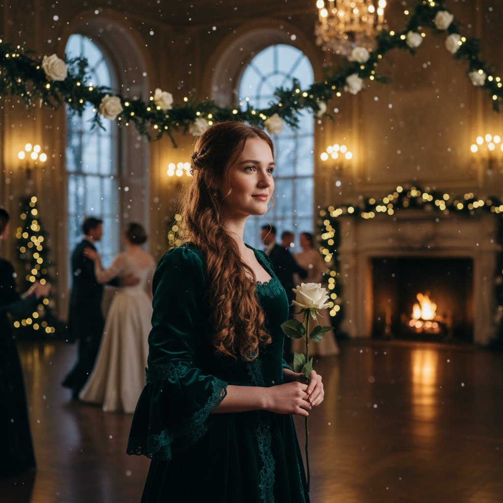 Long, cascading curls draped elegantly over one shoulder, creating a look of timeless romance perfect for winter semi-formal dances.