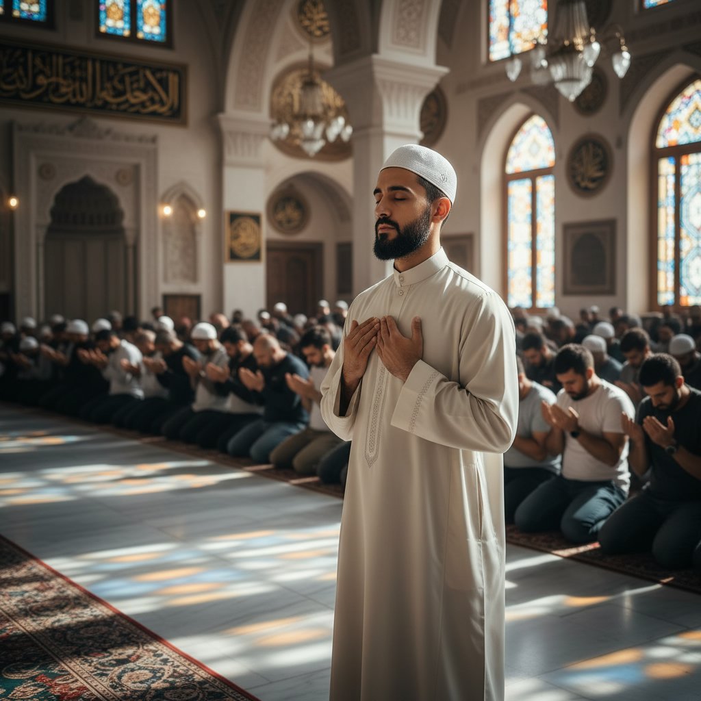 A clean and modest haircut, reflecting the Imam's role as a leader of prayer and a model of Islamic virtues.