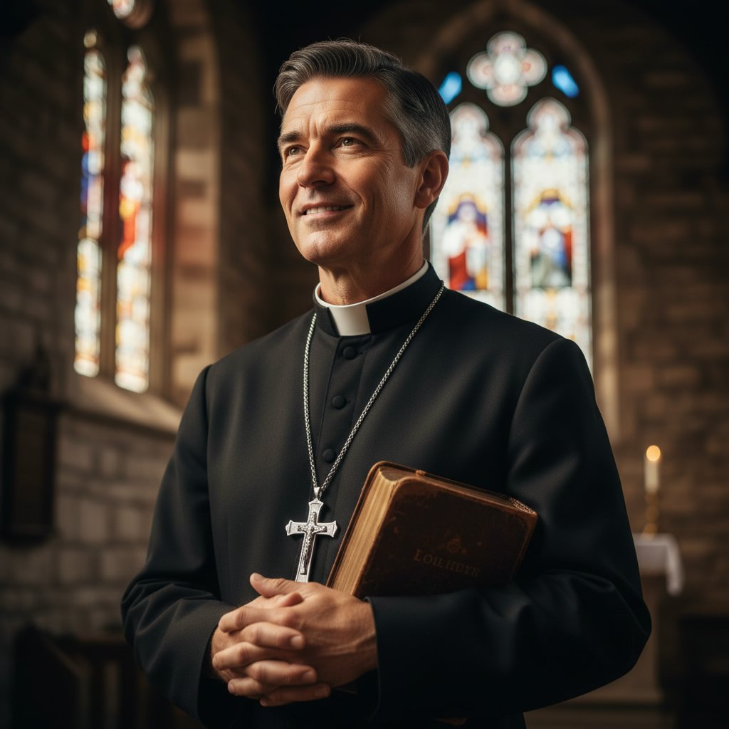 A classic side part, representing the priest's adherence to tradition and his role in guiding the community in worship.