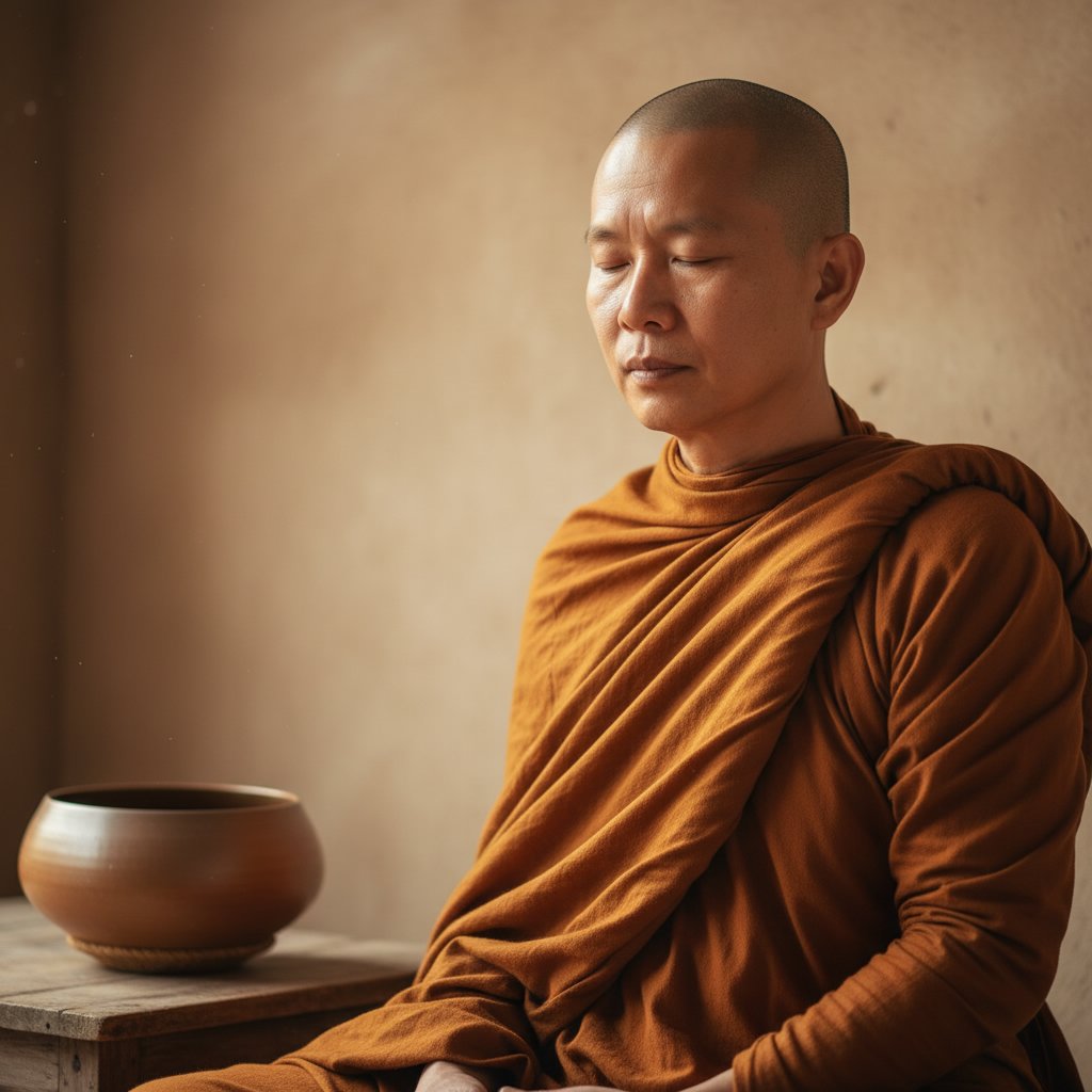 A traditional tonsure cut, signifying the monk's renunciation of worldly fashion for a life of spiritual devotion.